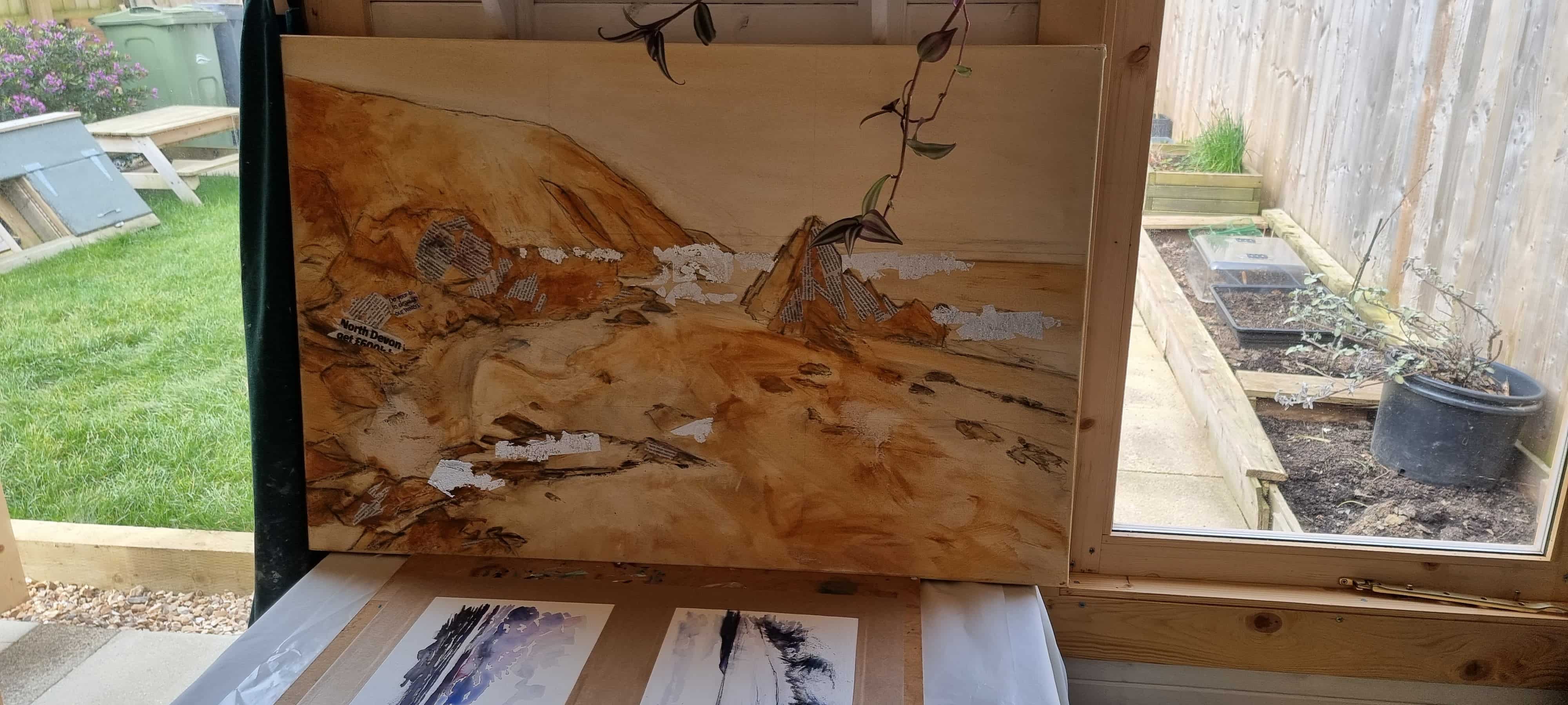 The conversation moves on then to the environment, one of the key talking points I had wanted to bring up when I had asked to meet with Amy. Her connection with the local area and the planet has become clear over the course of the conversation and she discloses her struggle with quite severe “eco anxiety” over the past few years. A passionate environmentalist, we speak about the extent the coastline has changed because of the changing weather patterns, the struggle that local farmers have with the recent dry spells and the unseen damage done by microplastics in the ocean. I recall seeing a newspaper clipping in one of her paintings that featured the headline, “Do your bit to clean up our waters”, subtly placed on the left side of the unfinished piece. “I had to step back for a while though”, she tells me, “it just felt like too much”.