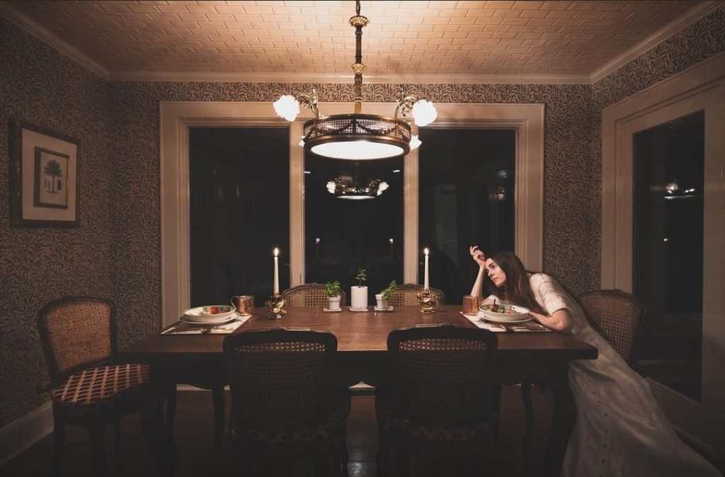 During her series ‘Rooms in the First House’, Tendler documented her grief, sense of loss, and isolation. One of her pieces, ‘Dinner in March’, features Tendler sat alone at a table set for two in a dimly lit room, staring longingly at the empty seat presumably prepared for Mulaney. Dressed in an elegant white gown, the piece conveys a feeling of melancholy as it captures the experience of handing yourself over to someone who is absent – giving everything you have to someone, who no longer wants the same.