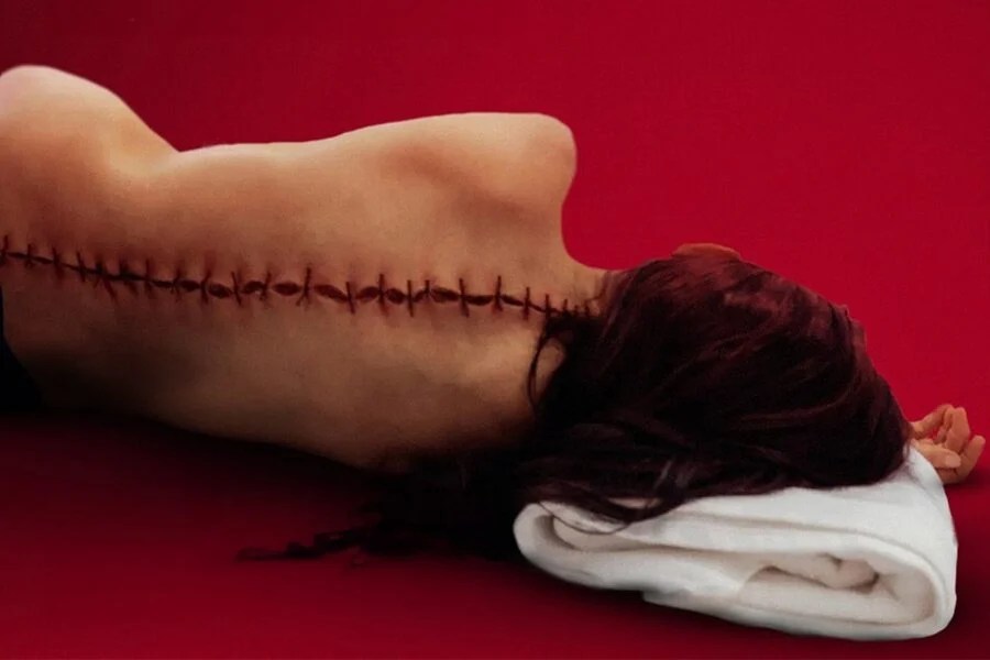 After examining her new body, Sue takes a hook and thread to sew up the gaping hole from which she came. Groans echoed throughout the theatre in which I was sat as Sue pierced fresh holes over and over again, feeding the thread in and out along Elisabeth’s spine. Although the result was the sexy Sue, the means to get there was a lifeless Elisabeth – her body limp on the cold white tiles, mouth agape, eyes staring for miles. This is The Substance’s portrayal of the behind-the-scenes horror of what it takes to be beautiful.